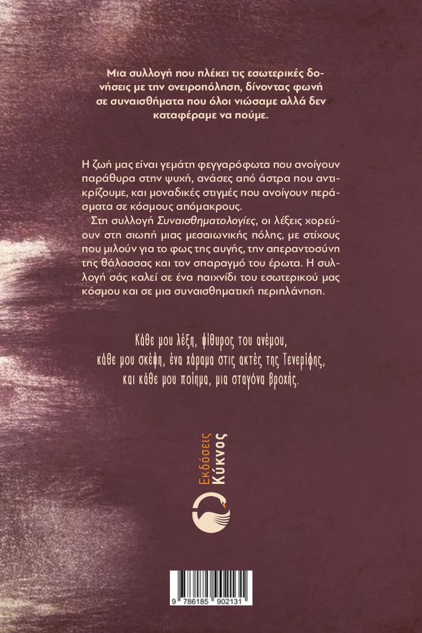 Στη συλλογή Συναισθηµατολογίες, οι λέξεις χορεύουν στη σιωπή µιας µεσαιωνικής πόλης, µε στίχους που µιλούν για το φως της αυγής, την απεραντοσύνη της θάλασσας και τον σπαραγµό του έρωτα. Η συλλογή σάς καλεί σε ένα παιχνίδι του εσωτερικού µας κόσµου και σε µια συναισθηµατική περιπλάνηση.